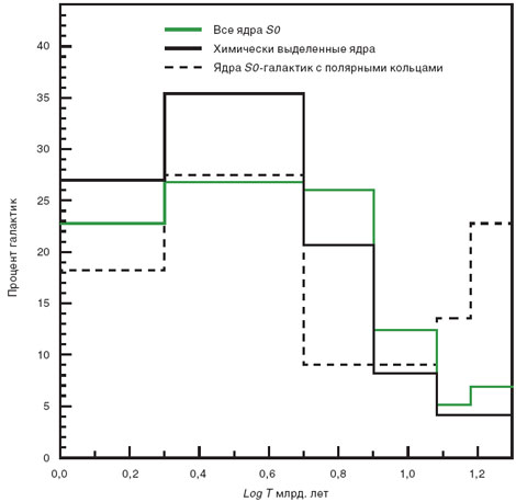 | Распределение абсолютных средних возрастов звездного населения в ядрах 60 исследованных линзовидных галактик. Средний возраст ядер в галактиках с химически выделенными ядрами (коричневая линия) составляет примерно 3 млрд. лет. В распределении возрастов звездных ядер галактик с внутренними газовыми полярными кольцами (пунктирная линия) наблюдается два пика. Первый из них (3 млрд. лет) характерен для галактик с внутренними газовыми полярными кольцами, обладающих химически выделенными звездными ядрами; второй (15 млрд. лет и более) — для галактик без химически выделенных ядер . |