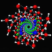 | Спиральная структура воды при высоком давлении внутри нанотрубки. Синим с зелёным показаны четыре одинарные спирали внутренней стенки, а красным с белым выделены молекулы внешнего слоя, образующие четыре двойные спирали (фото Xiao Cheng Zeng). |